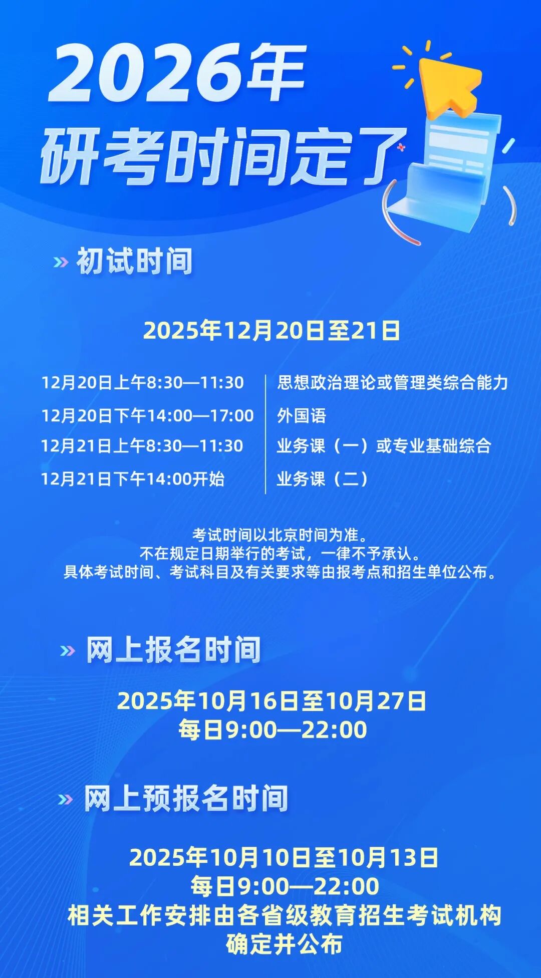 近日,教育部官方公布:2026年全国硕士研究生招生初试时间为2025年12月20日至21日。网上报名时间为2025年10月16日至10月27日(网上预报名时间为2025年10月10日至10月13日),每日9:00-22:00。