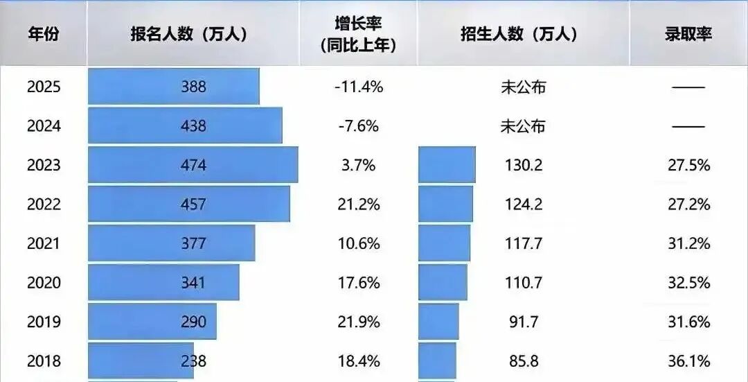 从历年考生人数及录取率来看,考研竞争一直处于白热化状态。2023年报考人数达到巅峰,突破474万人;尽管2025年报考人数略有下降,降至388万人,但这并非意味着考研难度降低。