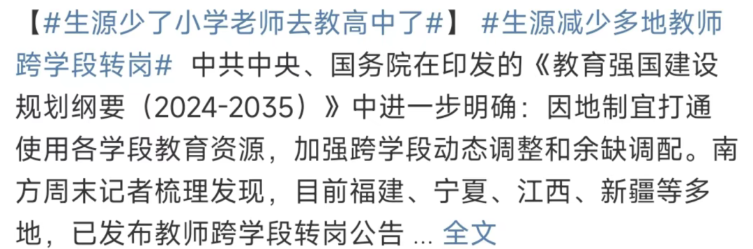 更有教师直言:一想到要在初中、高中教一辈子,就很绝望。这场席卷多地的教师转岗潮,背后藏着一个无法回避的现实:那就是小学教师正面临大面积“过剩”。