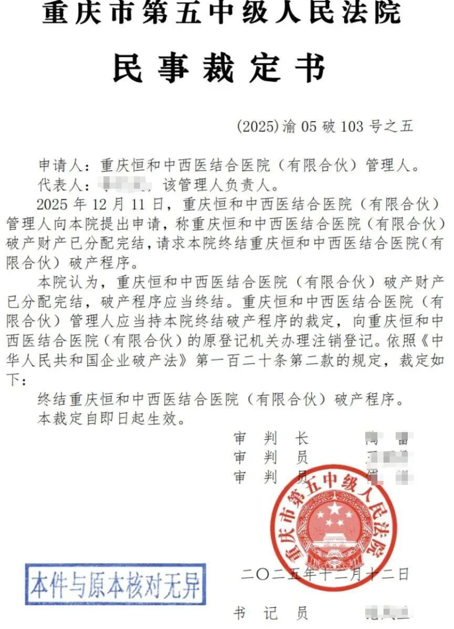 ❌重庆恒和中西医结合医院,注册资本超5000万元的高端机构,因管理混乱,停业两年后于2025年进入破产清算,商标被拍卖,资产处置举步维艰。