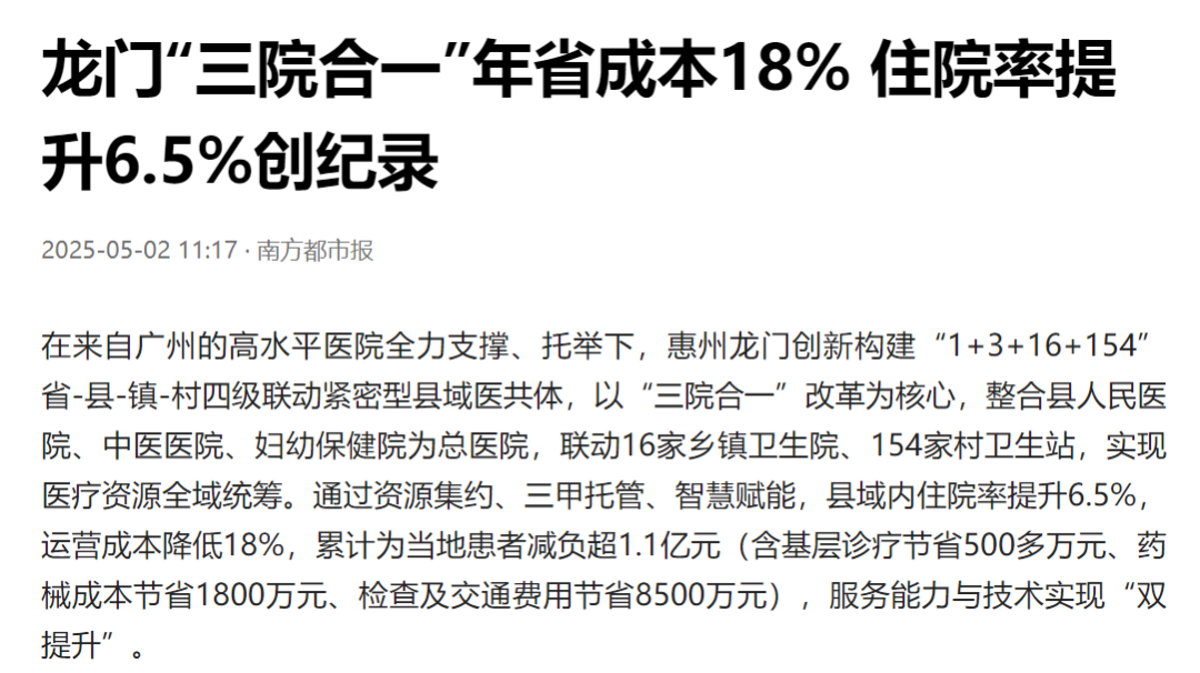 广东龙门县推进县人民医院+中医院+妇幼保健院整合组建总医院,合并后年运营成本降低18%,但同科室医护竞争加剧,不少基础医护面临被优化的风险。