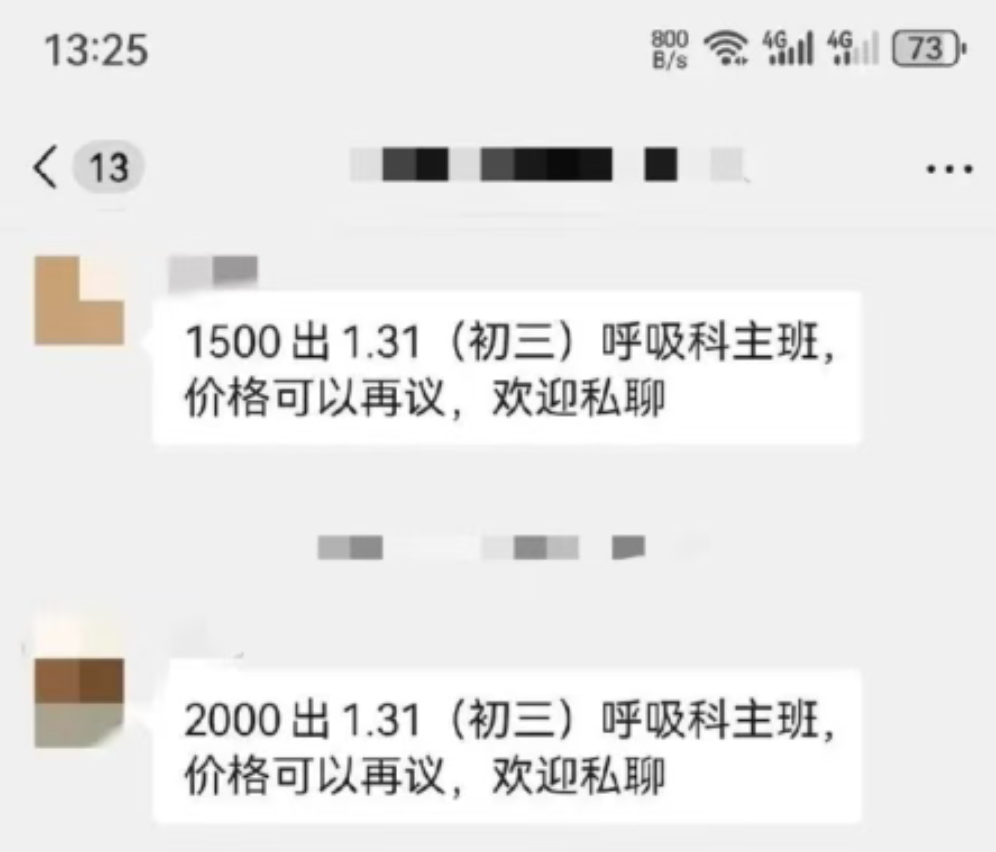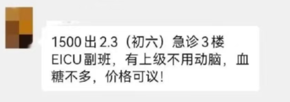 案例三:湖北某医院的一位急诊医生,从事急诊工作八年,春节值班对她来说是常态,可今年她却铁了心要把大年初一的班卖掉,出价1500元。