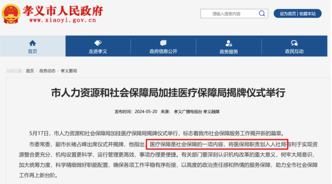 ✅山西省吕梁市孝义市:将医保局职责划入人力资源和社会保障局,在市人社局加挂医保局牌子,不再保留单独设置的医保局,通过职能整合实现社保与医保一体化管理。