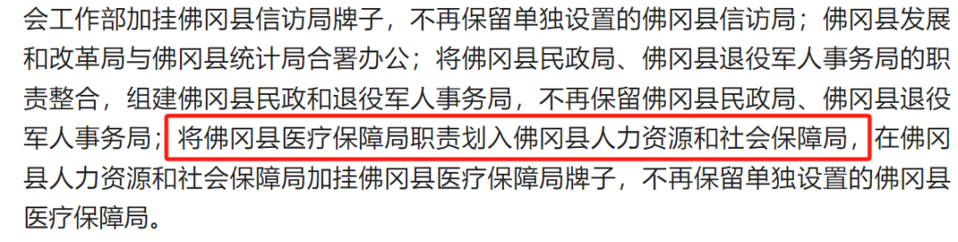 ✅广东省清远市佛冈县:医保局职责整体划入人社局,加挂牌子,不再保留单设机构。