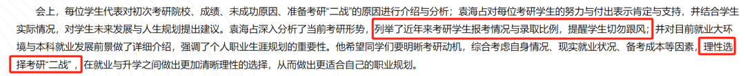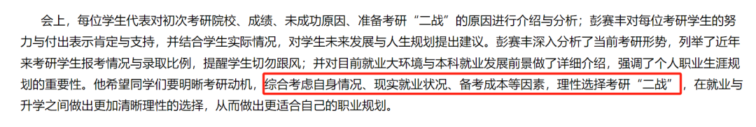 济南大学商学院曾召开过考研二战座谈会,希望学生们能够考虑自身情况以及备考成本等因素,理性选择二战。