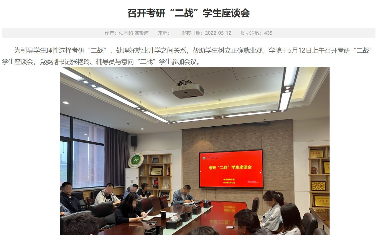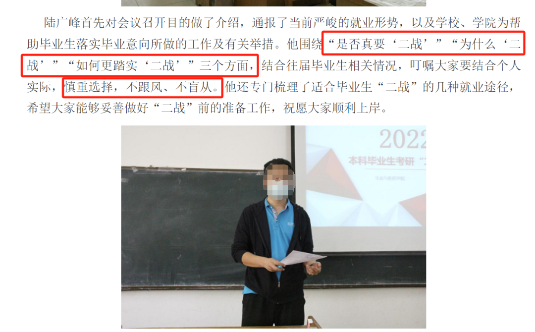 西北农林科技大学也针对考研二战学生召开了座谈会。要求每位二战考生对自己初次考研失利的原因进行分析总结,清晰认识考研的难度,谨慎选择二战。