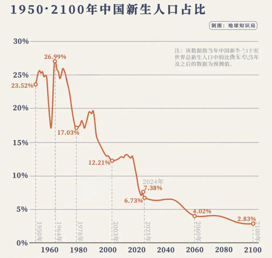 回顾历史,中国曾是全球新生儿的主要贡献者。1964年,我国出生人口占全球比例高达27%,每四个新生儿中就有一个来自中国。到了1976年,该数据降到了20%,2020年降到了10%,如今更是跌破至7%,整体呈现断崖式下滑的趋势。