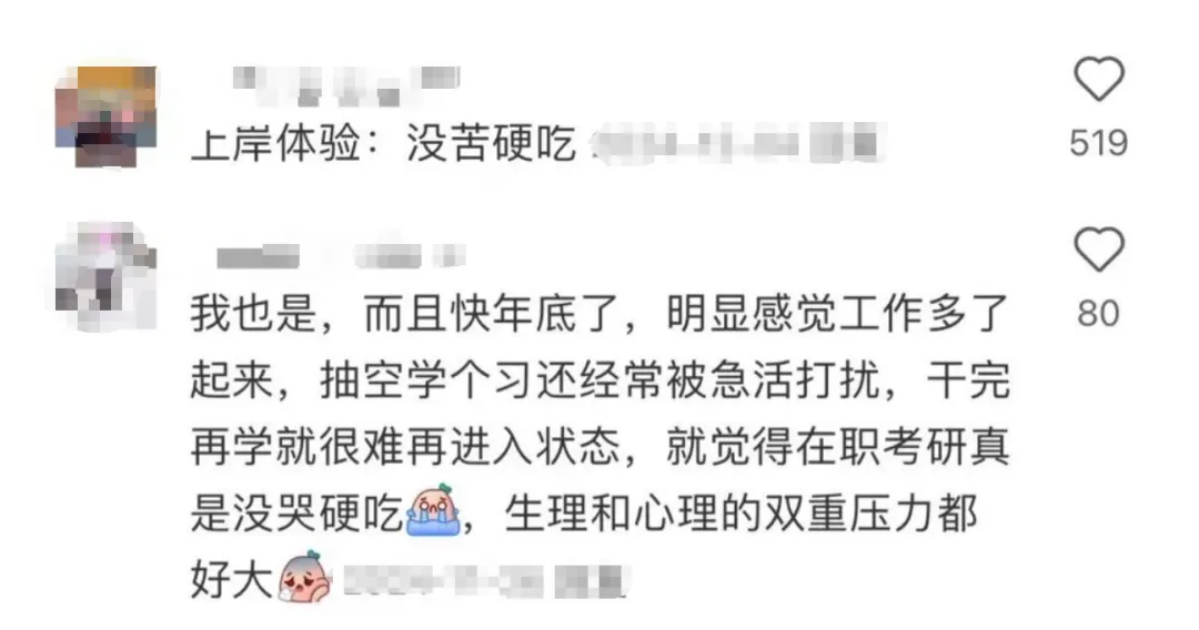 看到这些分享,小易想说:成年人的世界,确实没有容易二字。尤其是想在职读研的人,更需要付出双倍甚至更多的努力才行。但冷静下来想想:一个人,真的能同时承受工作+考研的双重负担吗?长期在高压下连轴转,身体和精神吃得消吗?
