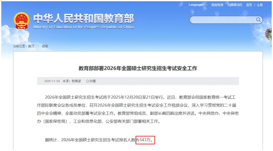 根据教育部11月24日公布的数据,2026年全国硕士研究生招生考试报名人数为343万,较上一年减少45万人。这是2023年开始连续第三年呈现下降趋势。