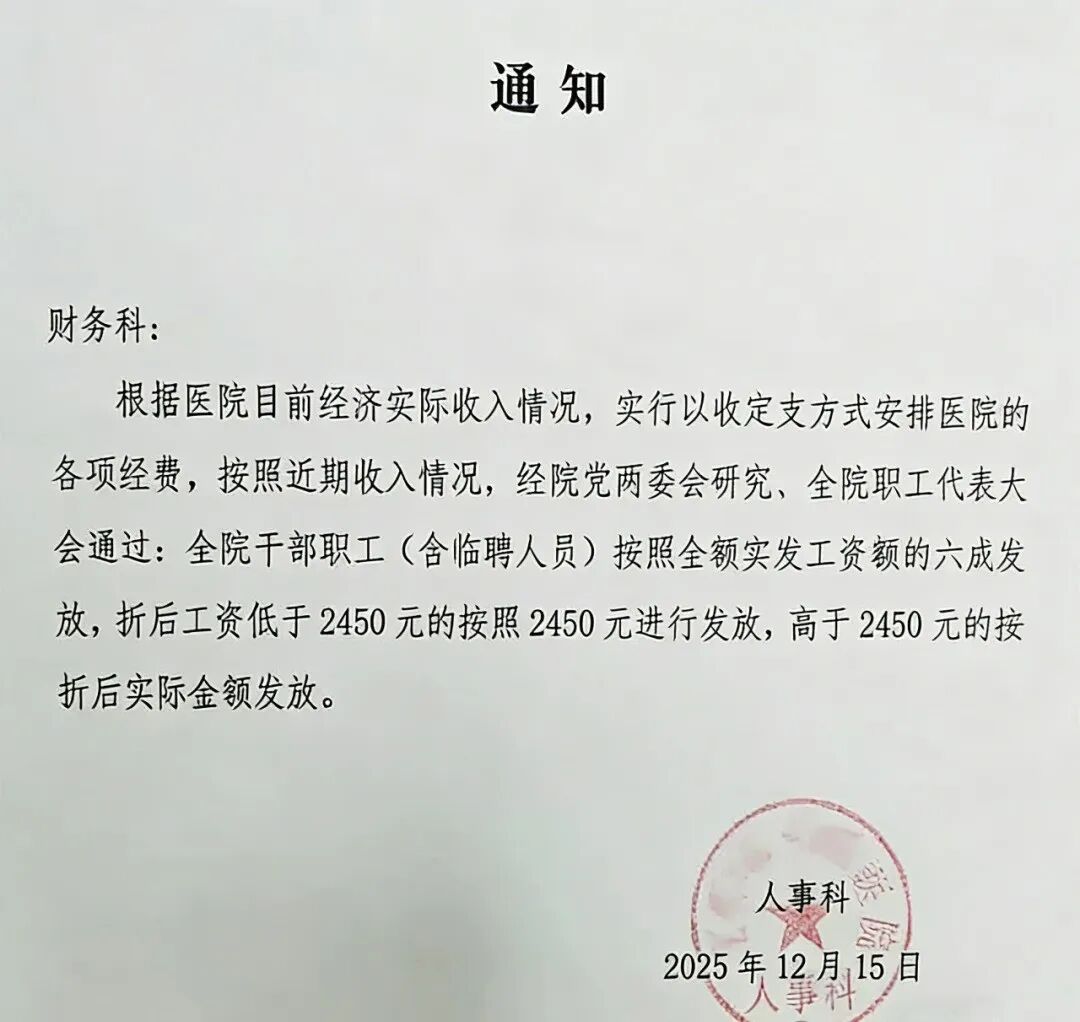 近日,广东某医院的一则工资调整中提及:受医院实际收入情况影响,经研究决定,全院职工统一按全额实发工资的6成发放,仅为低于2450元的人员设置保底标准。