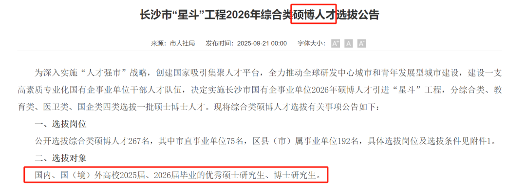长沙市2026年“星斗”硕博人才引进计划,所有岗位均面向硕士、博士开放,入选者直接享受全额拨款事业编制。