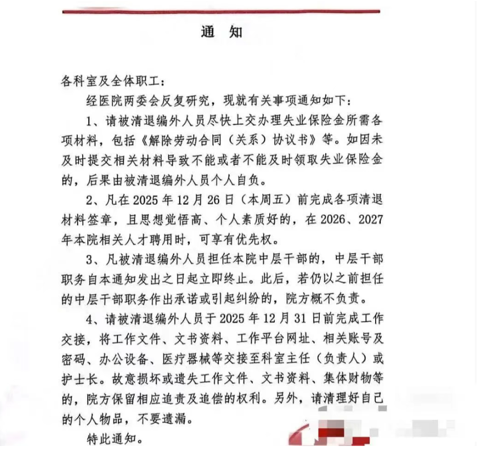 近期,湖北一名医务人员晒出的清退编外人员通知,在医疗圈掀起轩然大波。这份通知字里行间透着周密安排,既强调清退决定是医院反复研究商讨的结果,显得严谨合规,又提醒被清退人员尽快上交材料,方便顺利领取失业金,看似人文关怀十足。