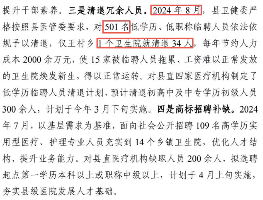 比如,新乡市封丘县的清退行动极具代表性。当地卫健委早在去年就启动了县直医疗机构“低学历临聘人员清退计划”,2024年和2025年两轮清退下来,人数已超过800名。