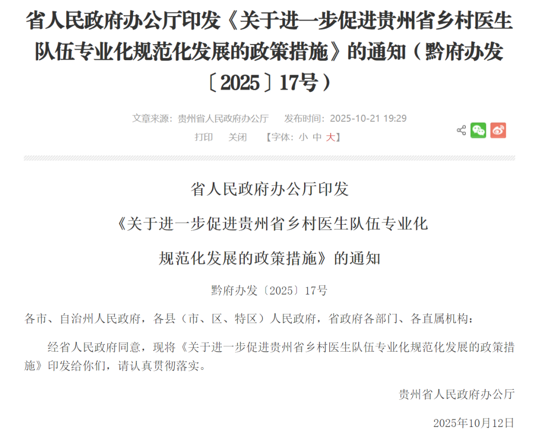 2025年10月,贵州省印发《关于进一步促进贵州省乡村医生队伍专业化规范化发展的政策措施》,明确加速低资质人员的清退,推动乡村医生队伍提质增效。